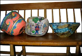 I've included below a lovely mosaic that I worked on with my kids when they were small. This piece was created by more traditional methods utilizing glue, grout and varnish. Many students enjoy working with mosaics because they can produce fast, professional results without much experience. It is one of the few processes that can be adapted for so many grade levels. The last two photographs are of paper mache bowl samples that include mosaic applications. I crafted these for future lessons in my art classroom.
